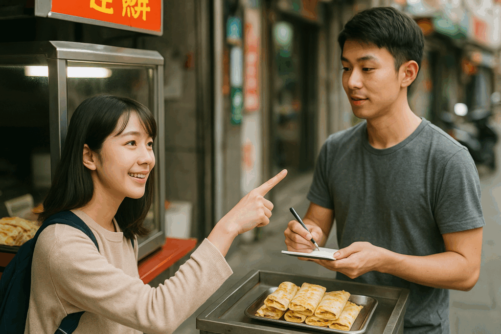 屋台は英語があまり通じないことが多いですが、前述の通り、指さしと「蛋餅一張」という簡単なフレーズで十分にコミュニケーションが可能です。
